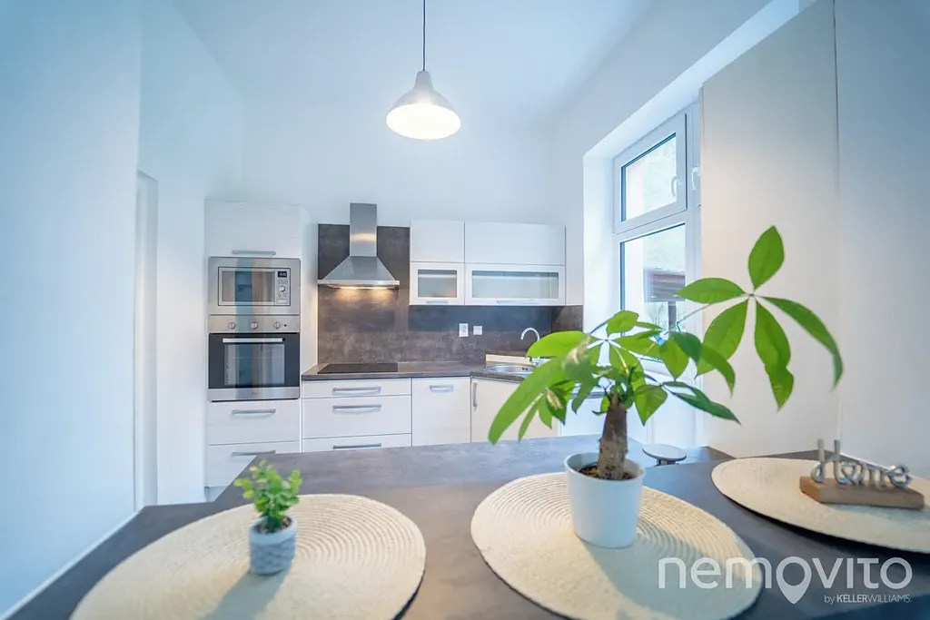 Kuchyně je prakticky řešená a vybavená vším, co potřebujete pro každodenní fungování – varná deska, trouba, mikrovlnná trouba, digestoř i myčka. A právě z kuchyně se dostanete zadním vchodem ven, kde na vás čeká příjemné posezení pod pergolou a kousek zahrádky. Ideální místo na ranní kávu, letní večeře nebo chvíle klidu po práci.