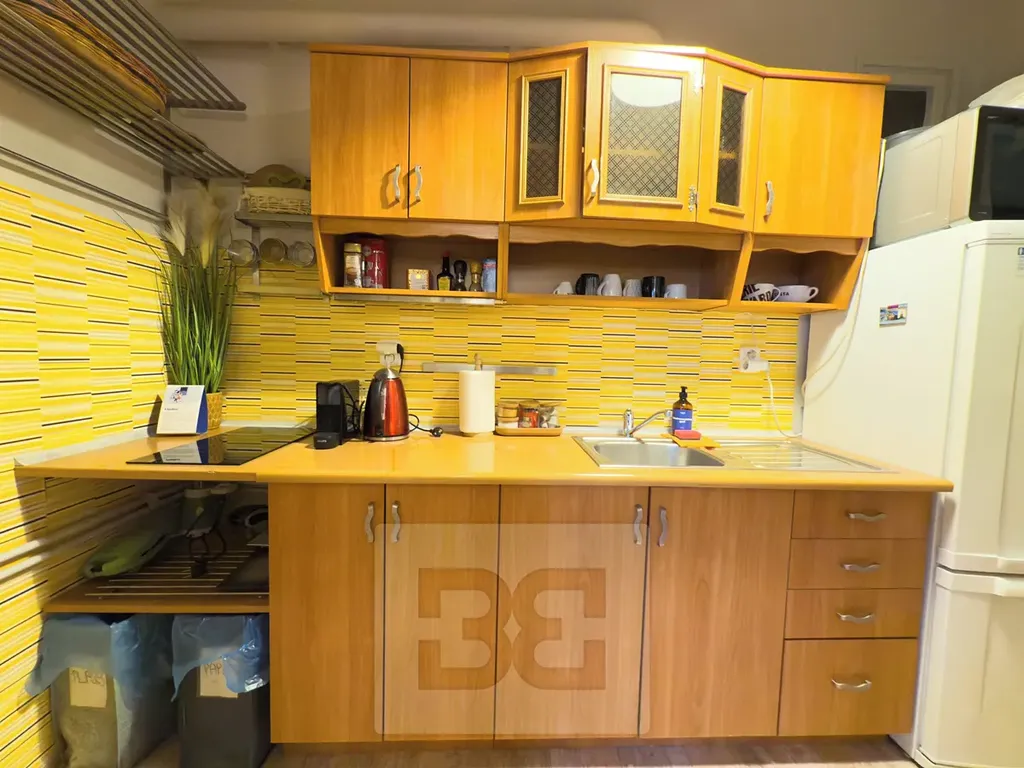 Byt je vybaven kuchyňskou linkou se spotřebiči, za kuchyní najdeme menší prostor pro uskladnění věcí.