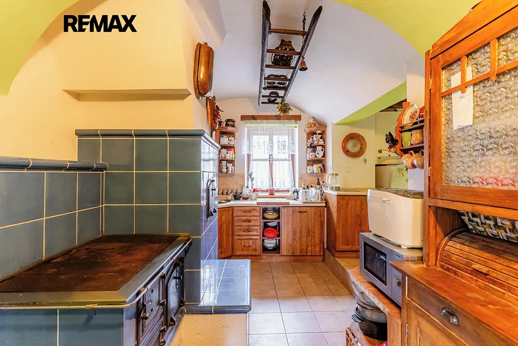 V interiéru najdete dřevěná okna, přiznané trámy a další autentické prvky, které dodávají domu jedinečný charakter jako například přiznaná stěna z kamenů v jídelně. V kuchyni jsou původní kachlová kamna, další kamna lze využít i v obytném pokoji. Podlahy v přízemí (kuchyně, chodba a koupelna) jsou temperované.