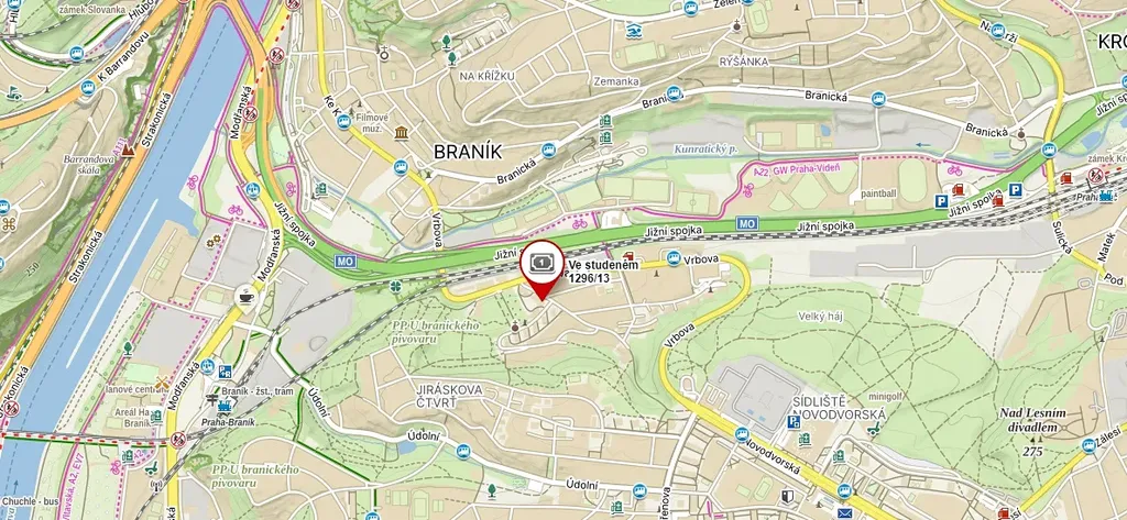 Parkování u domu, dostupnost MHD bus na metro linky „B“ a „C“ a dále tram linky 2, 3, 7. 17, 21 27 nebo vlak ze stanice Praha-Braník do centra.