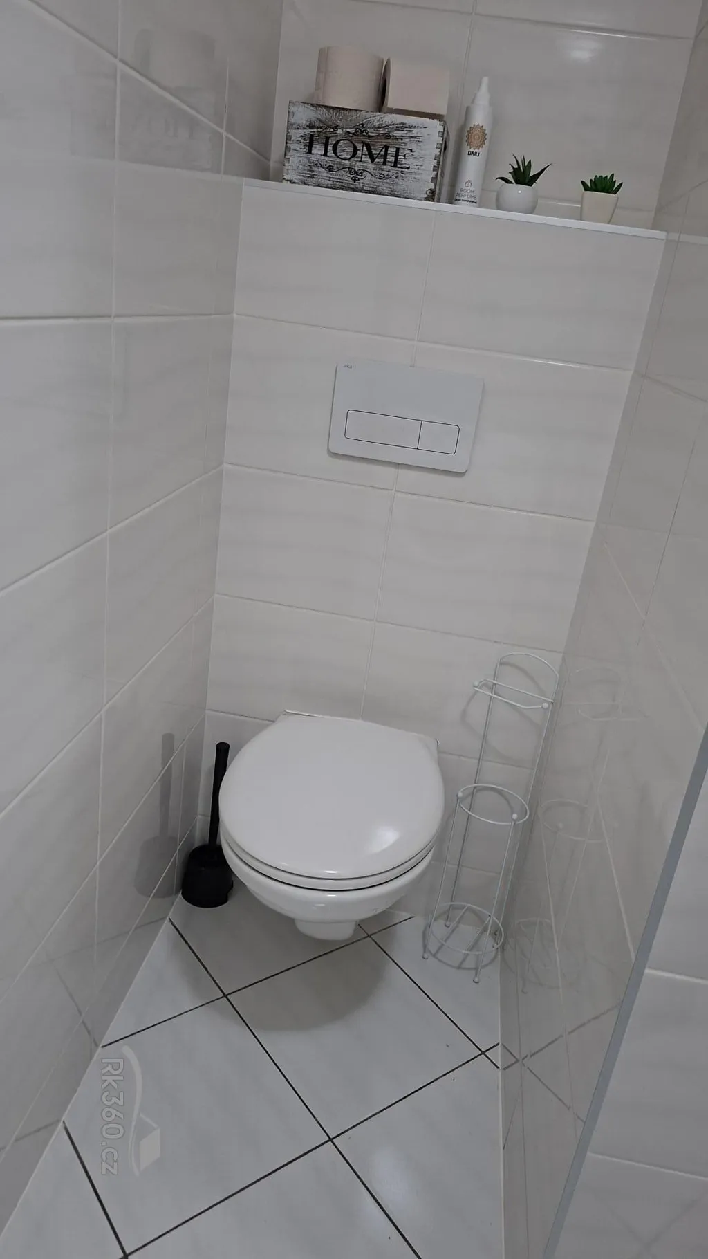 Koupelna: sprchový kout se skleněnou zástěnou, závěsná toaleta, umyvadlo, topný žebřík, odvětrávání a prostor pro pračku i sušičku.