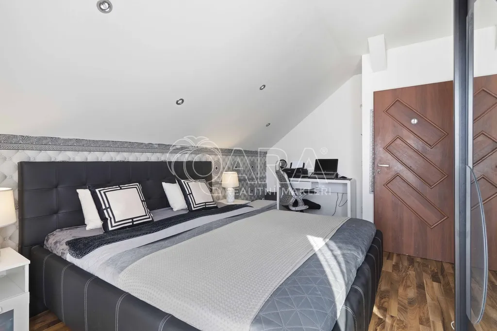 Druhou část domu o dispozici 3+kk tvoří obývací pokoj s kuchyňským koutem (cca 32 m2) a koupelnou s rohovou vanou a toaletou (cca 6 m2) a předsíň se schodištěm. Druhé nadzemní podlaží sestává ze dvou pokojů (cca 15,5 m2 a cca 17,5 m2)a koupelny se sprchovým koutem a toaletou (cca 6,2 m2). Ze dvou pokojů je vstup na společný balkon. V obývacím pokoji s kuchyňským koutem zavedeno podlahové vytápění, v ostatních prostorech instalovány radiátory.