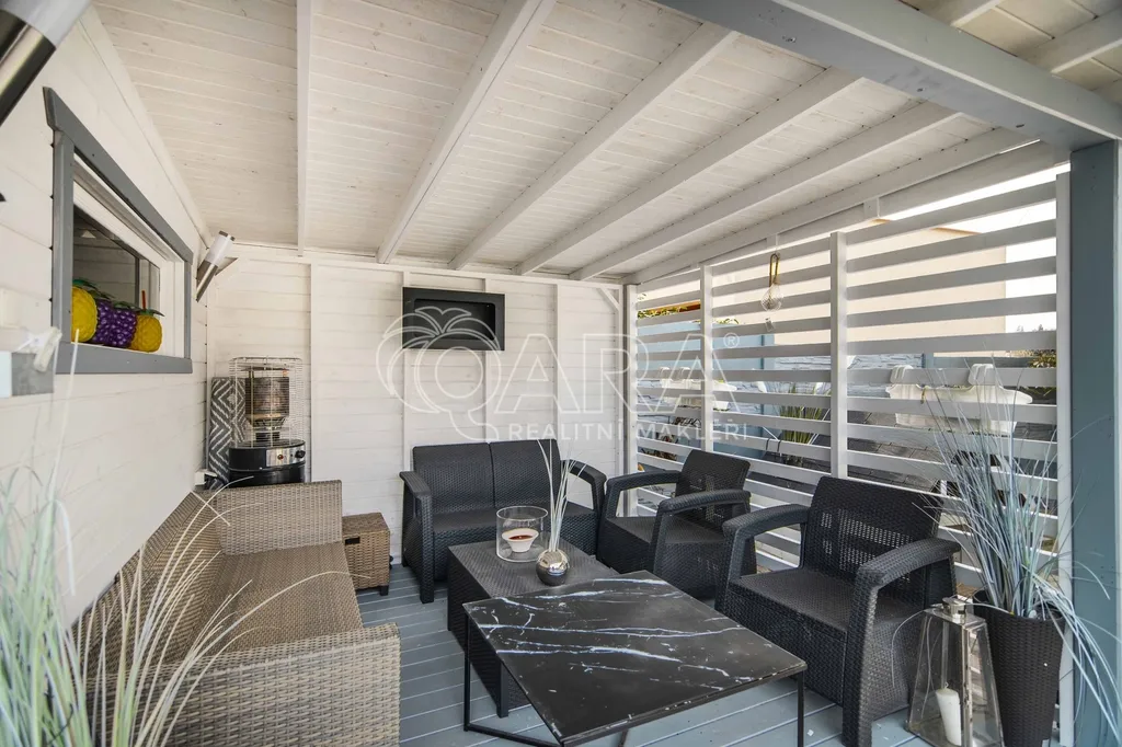 Na rovinatém pozemku o celkové výměře 561 m2 (vč. zastavěné plochy a nádvoří)se nachází zahradní domek s pergolou, bazén, zastřešení parkovacího stání. U domu na pozemku lze dále zaparkovat až tři vozidla. Před plotem další dvě vozidla.