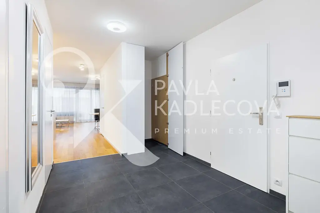 Po vstupu vás přivítá velkorysá vstupní chodba se šatnou a botníkem. Hlavní obytný prostor tvoří světlý obývací pokoj propojený s plně vybavenou kuchyní včetně všech elektrospotřebičů. Z obývací části je přímý vstup na zastřešený balkon, ideální pro relaxaci po náročném dni. Díky prostornému řešení je zde místo pro velkou rozkládací sedací soupravu i jídelní část.