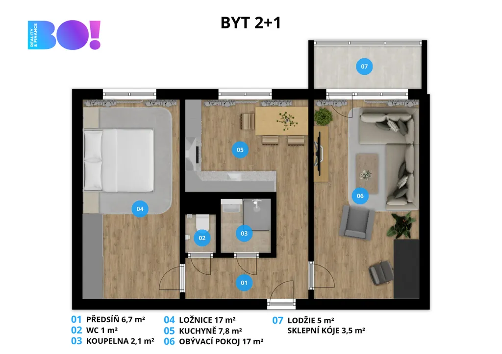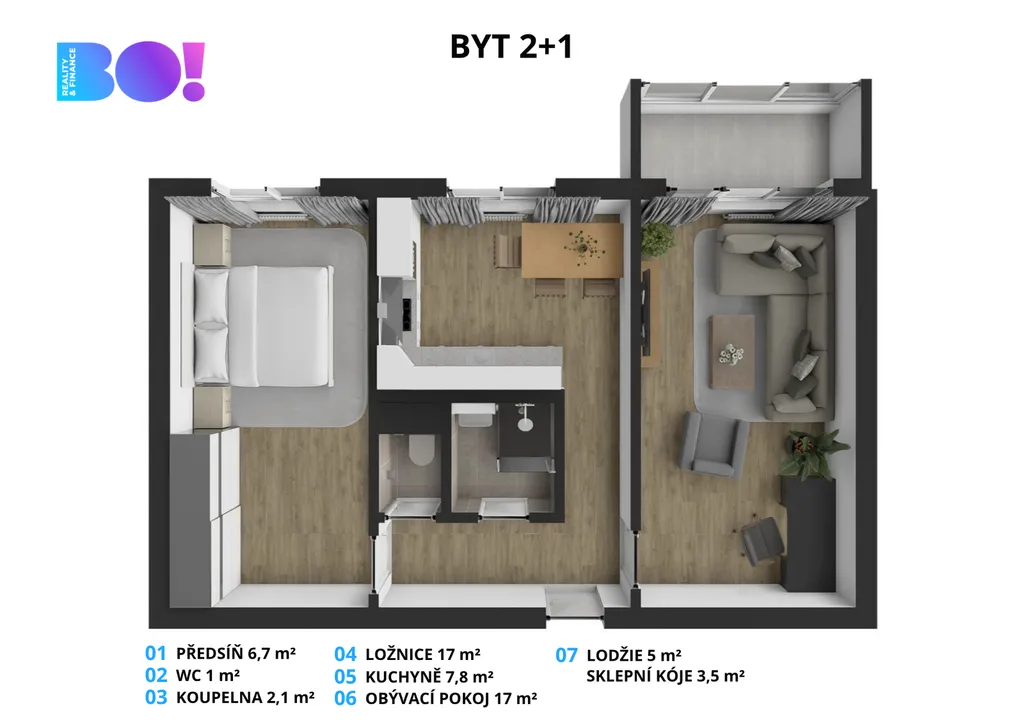 K bytu o velikosti 51,6 m² náleží lodžie o výměře 5,25 m², která poskytuje příjemný prostor k relaxaci a také sklep o velikosti 3,5 m², jenž nabízí dostatek úložného prostoru.