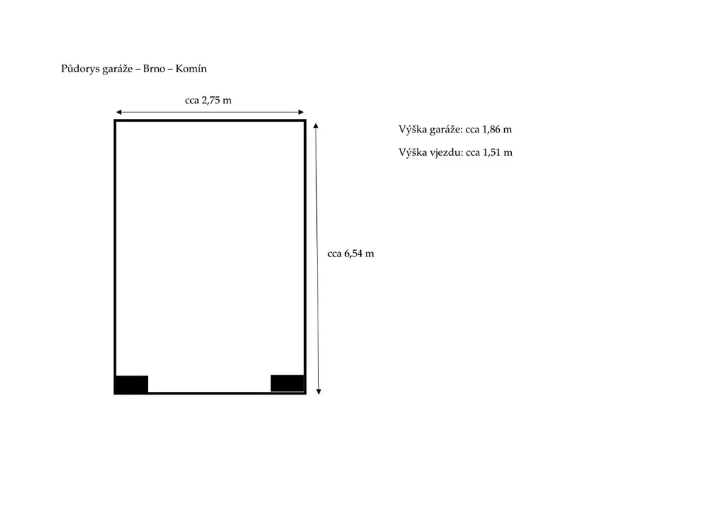 šíře u vjezdu mezi vraty cca 1,86 m, šíře na konci garáže cca 2,75 m, délka garáže cca 6,54 m. Výška vjezdu je cca 1,51 m a výška garáže samotné je cca 1,86 m.