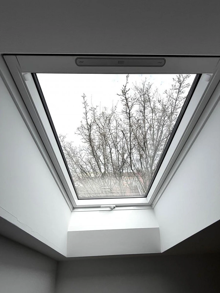 Další obytnou místností je pokoj o výměře cca 14,31 m², který je přímo ideální jako ložnice. Je zde střešní okno, které má funkční mikroventilaci, aniž byste otevírali okno. Zde bude vnitřní roleta.