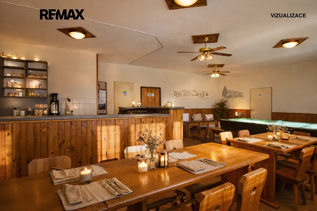 Nemovitost se skládá ze dvou staveb – obytné části a samostatné nebytové části se sálem a výčepem. Je vhodná jak pro rodinné bydlení s podnikáním, tak pro investora hledajícího nemovitost s přidanou hodnotou.