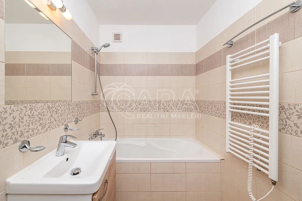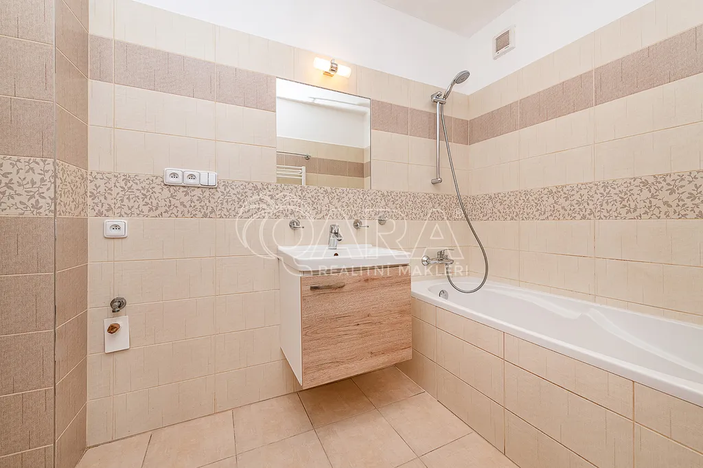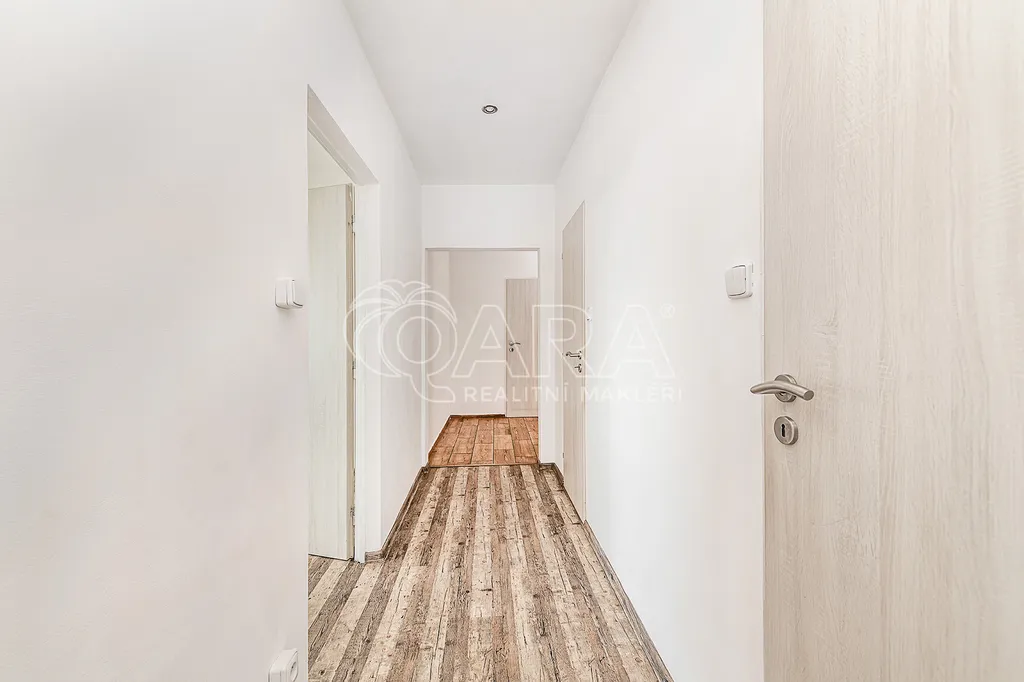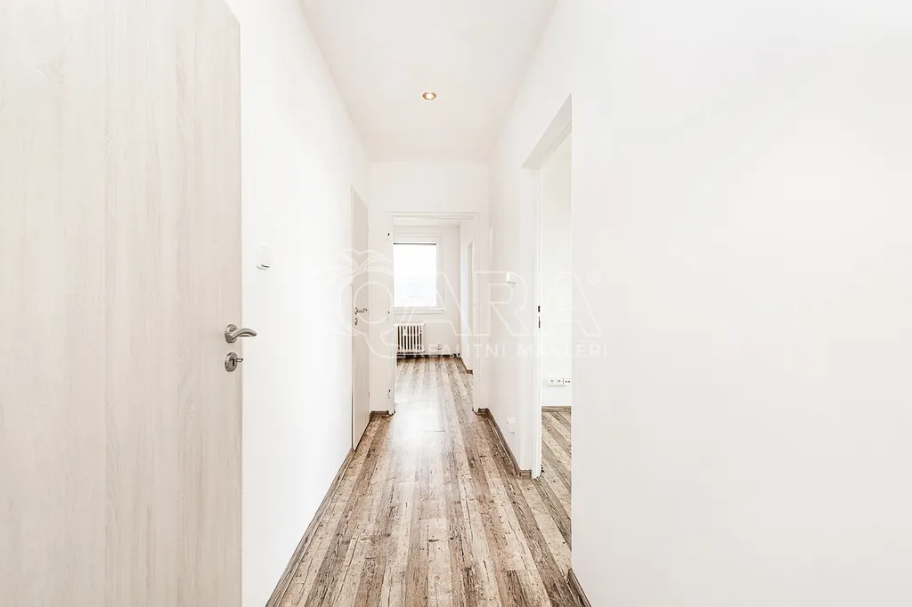 Byt je po rekonstrukci se zděným jádrem a praktickou prostornou šatnou/komorou přístupnou z předsíně. Byt je vybaven kuchyňskou linkou s plynovou varnou deskou a troubou, digestoř je odvětrávaná do šachty. Lednici je možné schovat do linky či zvolit volně stojící (ledničkou není byt vybaven). Prostorná koupelna s vanou a místem pro pračku, wc oddělené. Vytápění a ohřev vody centrální z vlastní plynové kotelny. Plastová okna. Zasklená lodžie. Na podlahách je dlažba a v obytných místnostech jednotná vinylová podlaha.
