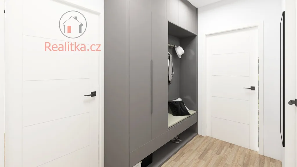 • Přízemí: Prostorná chodba, technická místnost, WC, obývací pokoj s chytře odděleným kuchyňským koutem a terasa navazující na obývací pokoj, čímž se vytváří plynulý přechod mezi interiérem a exteriérem.