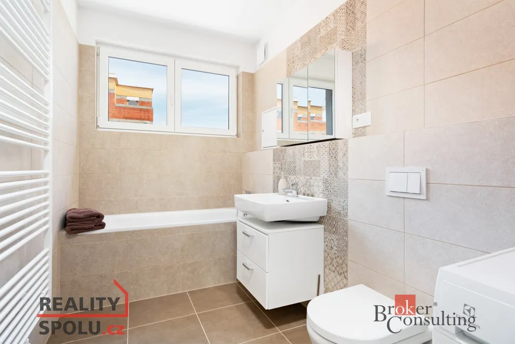 Koupelna je vybavena také pračkou se sušičkou.
