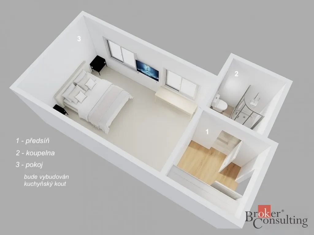 Vyspí se zde pohodlně 3 osoby, v pokoji najdete dvě velmi pohodlné postele, příjemnou pohovku, stolek, křesílko, součástí vybavení je i televizor, rychlovarná konvice a kávovar. Koupelna v moderních barvách dřeva a bílé nabízí sprchu, umyvadlo a wc. V prostorné předsíni je velká vestavěná šatní skříň. Kuchyň zde zatím není, po dohodě lze buď snížit cenu nebo v ceně majitelé zajistí vestavbu menší kuchyňky.