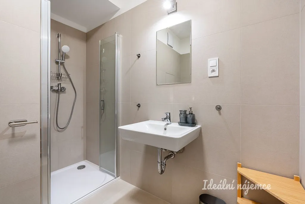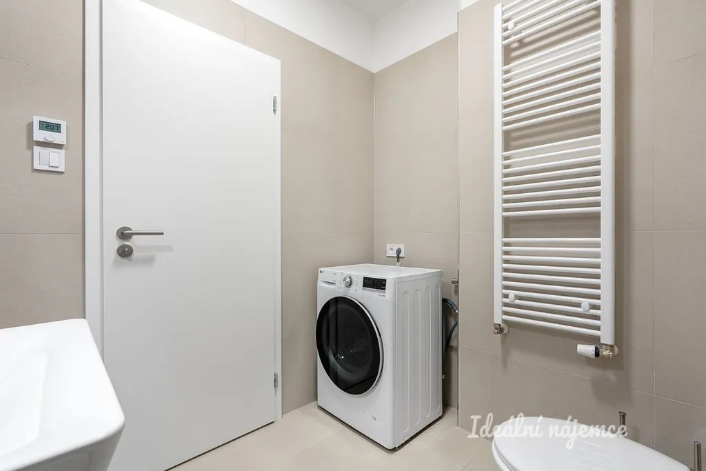 Koupelna je provedena v moderním standardu s důrazem na detail – nabízí prostorný sprchový kout s nízkým nástupem, závěsné WC, umyvadlo se zrcadlem a pračku kombinovanou se sušičkou. Komfort doplňuje podlahové vytápění a topný žebřík. Velkoformátová dlažba v příjemném dekoru podtrhuje čistý a nadčasový vzhled.