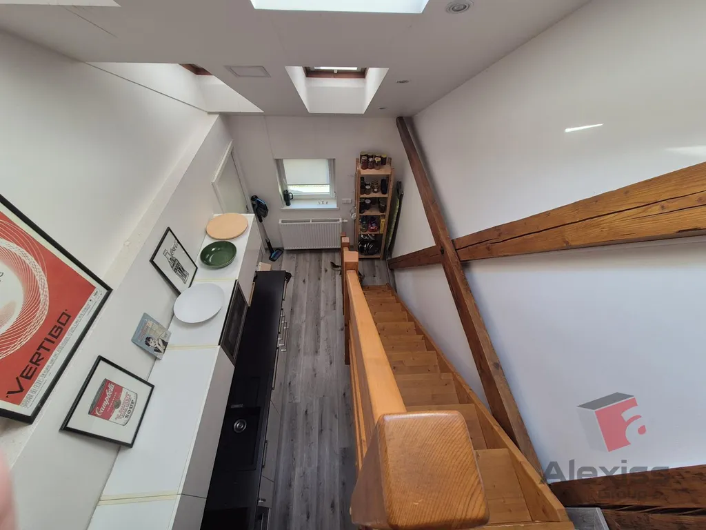 - Přiznané dřevěné trámy dodávají prostoru jedinečný charakter