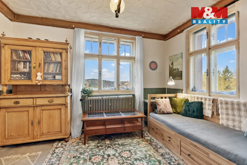 Nabízíme ke koupi rodinný dům v žádané lokalitě - obec Albrechtice v Jizerských horách. V přízemí domu kuchyně s jídelním koutem sousedící s obývacím pokojem. Koupelna s vanou a umyvadlem, toaleta samostatná. Předsíň s úložným prostorem. Schodiště nás zavede do 1. NP kde jsou 2 ložnice a pokoj s balkónem. Půda pochozí s možností vybudování dalších místností. Dům částečně podsklepený. Vytápění zajištěno plynovým kotlem a krbovými kamny, ohřev vody bojler. Podlahy dřevěné, PVC a koberec. Zahrada okrasná se stodolou, která skýtá další úložné prostory. Z domu nádherný výhled do okolí. V těsné blízkosti obchod, škola, vyhlášený lyžařský vlek Špičák. V okolí nepřeberné množství výletních míst, cyklotras a běžkařských tratí. Více informací sdělí makléř na prohlídce.