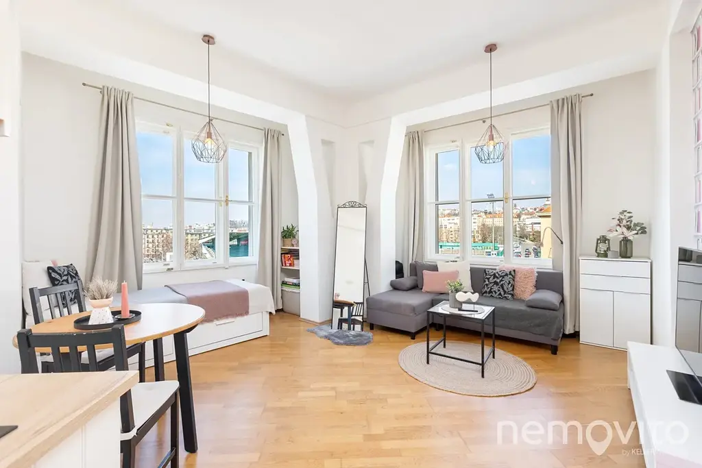 Jednopokojový byt s dvojicí velkých oken, který v kombinaci s vysokým stropem vytváří skutečně neobyčejný dojem. Jednotka je umístěná v pátém podlaží architektonicky zdařilého domu (architekt je autorem rovněž Veletržního paláce) se zajímavým výhledem do okolí, a na ploše 34 m2 nabízí vše potřebné pro danou kategorii bytu.