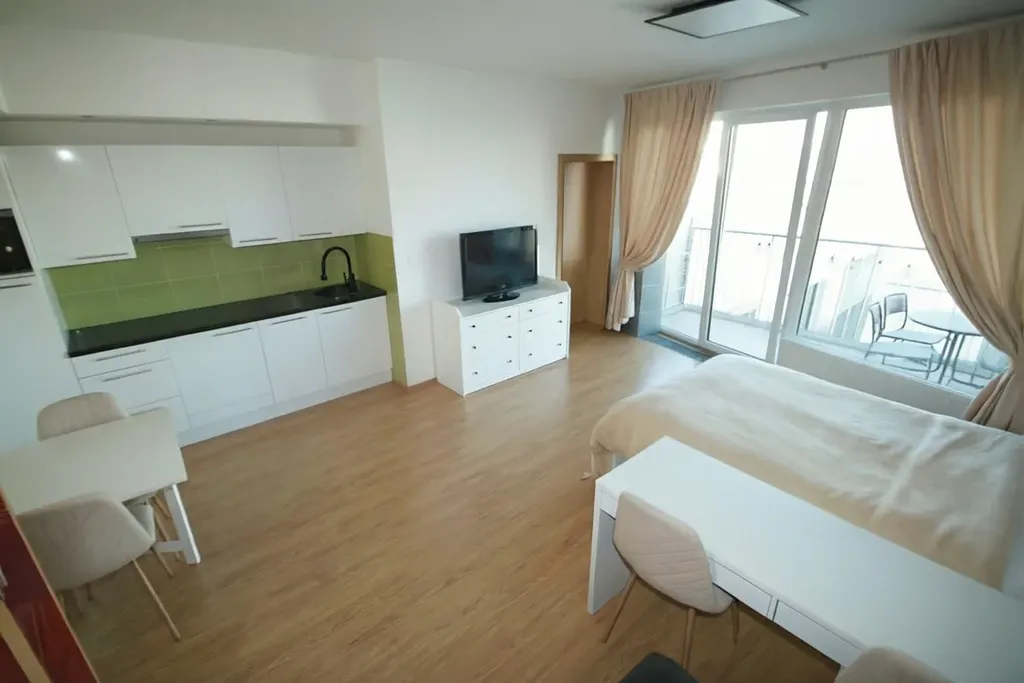 Dominantou bytu je velkorysý obývací pokoj, který díky velkoformátovým oknům působí velmi vzdušně. K bytu náleží prostorná lodžie 6 m2, která není započtena do obytné plochy a nabízí příjemné místo pro relaxaci a sklep 2,5 m2.