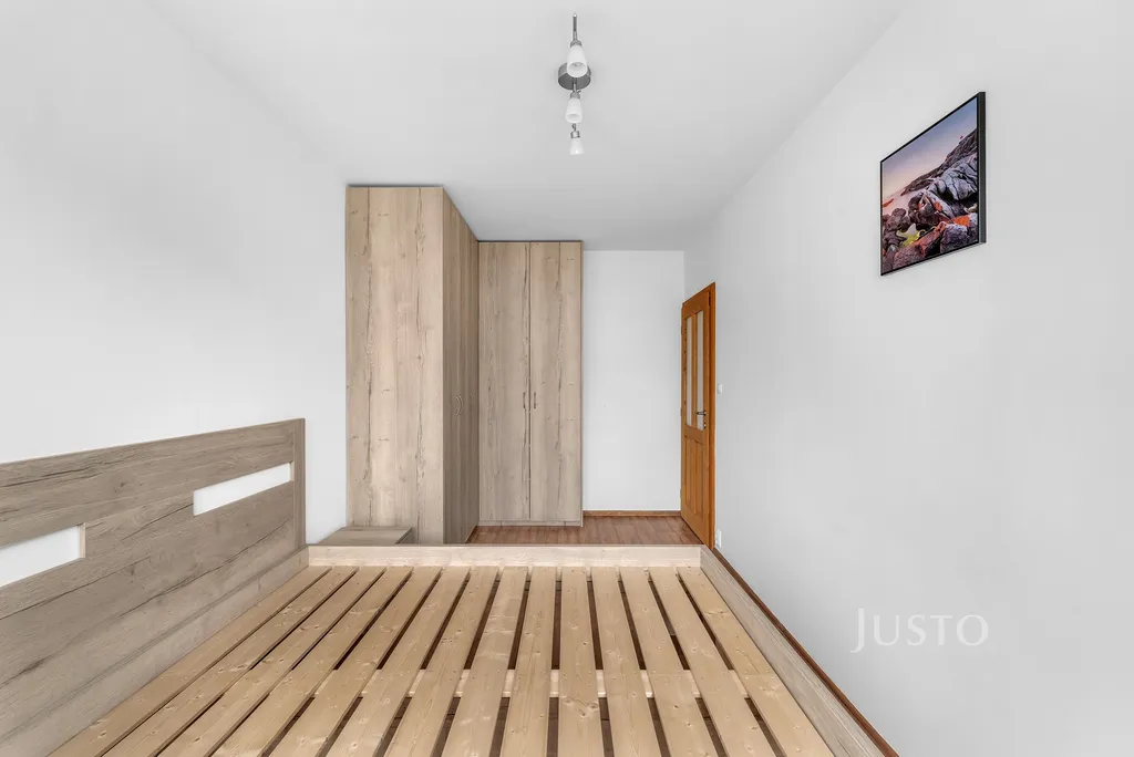 Dispozice bytu je vhodná zejména pro rodinu s dětmi. K dispozici jsou dva neprůchozí pokoje, které lze využít jako ložnici a dětský pokoj, případně pracovnu. V prostorném obývacím pokoji je místo na jídelní kout i odpočinkovou zónu a je propojen s moderní kuchyní na míru vybavenou myčkou, plynovou varnou deskou a elektrickou troubou. Kuchyňská linka v červeném designu nabízí dostatek úložného prostoru. V koupelně naleznete vanu, která je praktická jak pro děti, tak i pro relaxaci po náročném dni.