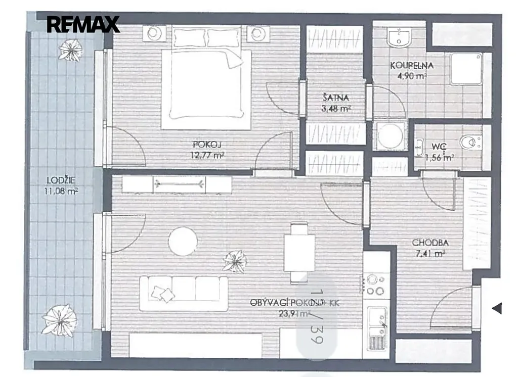 Součástí bytu je prostorná lodžie o velikosti 11 m² s otevřeným výhledem, garážové stání a sklepní kóje (2 m²).