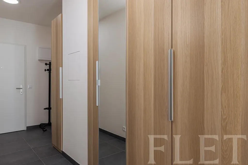 Obývací prostor s kuchyňským koutem je díky velkým oknům příjemně světlý a propojený s venkovním prostorem. Kuchyň je plně vybavená, nechybí vestavná pračka ani myčka. V chodbě je k dispozici velká šatní skříň, koupelna je vybavena sprchovým koutem a toaletou.