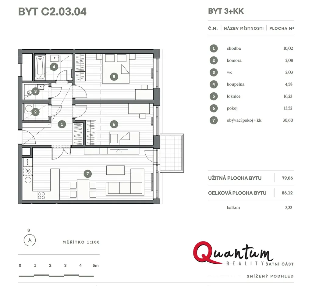 Celková užitná plocha bytu je 86 m², dále je k dispozici balkón, sklep i parkovací stání. Byt je novostavba, připravený k okamžitému nastěhování, bez nutnosti dalších investic.