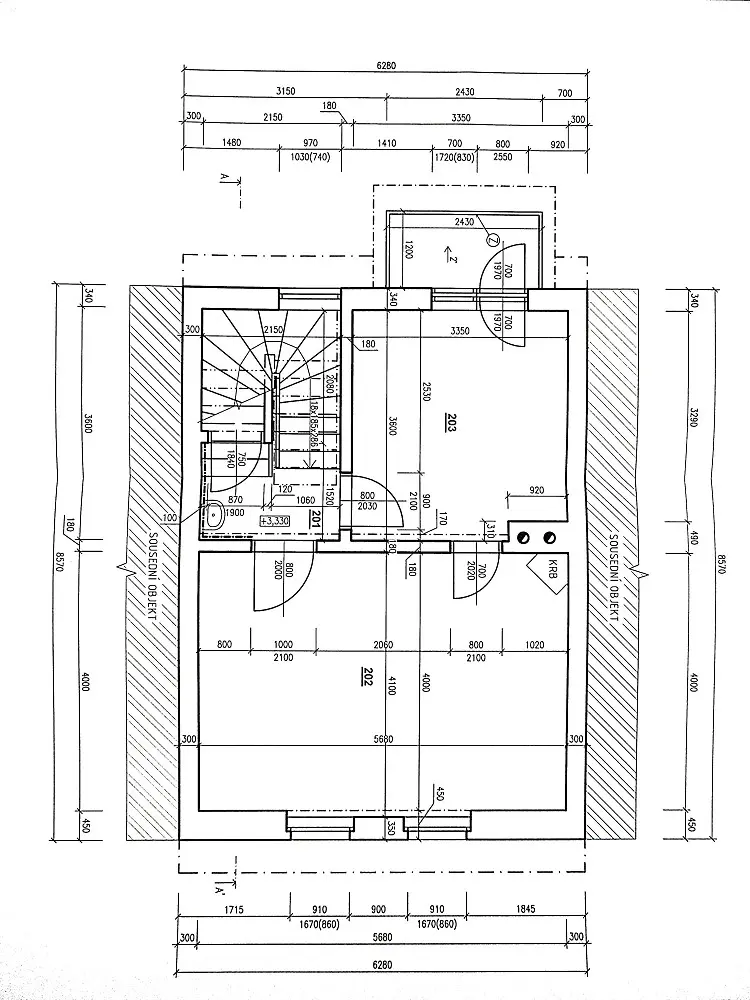 Z podesty v 1.patře je možno po schodech vyjít do podkroví (+ 40 m²), se zavedenou elektřinou a topením, které lze přebudovat na komfortní obytné - dříve sloužilo jako letní pokoj pro teenagery.