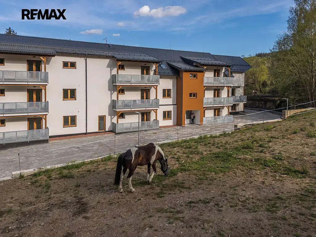Nabízíme k prodeji podhorský apartmánový byt se dvěma terasami ve městě Vrbno pod Pradědem, nově postavený s důrazem na kvalitní provedení. Byt nabízí komfort trvalého bydlení v srdci přírody a krásný výhled na pohoří Jeseníků. Je vybaven sklepní kójí, lyžárnou, terasou a parkovacím stáním v ceně. Jeho orientace je na jihozápad, což zajišťuje dostatek slunečního svitu a nachází se v prvním nadzemním podlaží. Byt je napojen na městský vodovod a kanalizaci a v každé místnosti je podlahové vytápění pro maximální komfort.