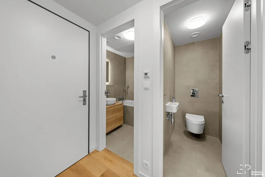 Dispozice: vstupní chodba (prostor pro vestavěnou šatní skříň a pračku), koupelna s vanou, samostatné WC, obývací pokoj s prostorem pro obývací část a prostorově oddělenou kuchyň se sezením, dvě ložnice s terasou. Součástí bytu je prostorná sklepní 5,2m2 kóje a jedno kryté parkovací stání (širší 3,4m) v části jen dvou parkovacích stání, přímo vedle vchodu k bytu.