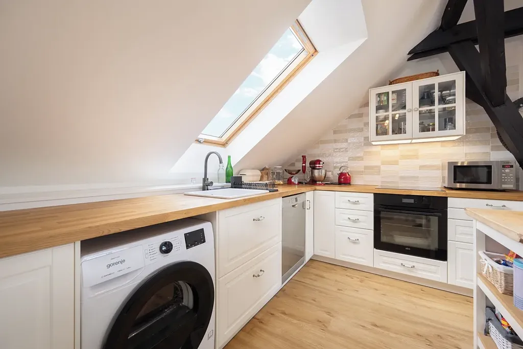 Dominantním prostorem je obývací pokoj s kuchyní ve tvaru L. Světlo přináší velkoformátové okno s výhledem do krajiny a také na nově rekonstruované náměstí a klidného vnitrobloku.