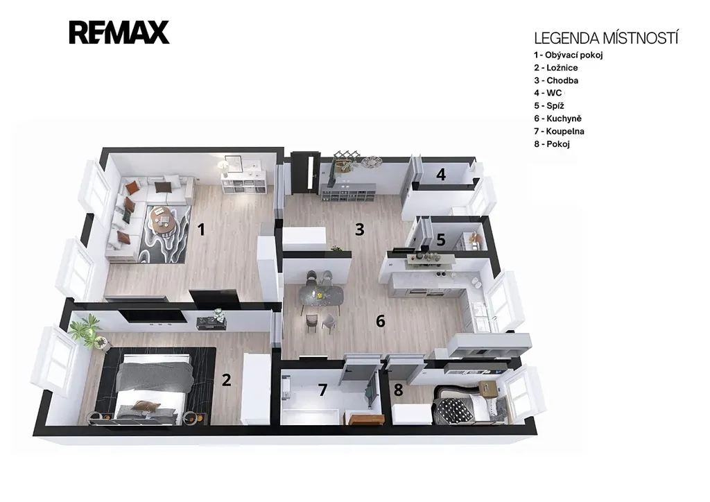 Byt je situován ve zvýšeném přízemí cihlového domu a vyniká především svou vzdušností a velkorysým dispozičním řešením. Velkou předností je praktická komora, která nabízí dostatek úložného prostoru, případně realizace malé soukromé kanceláře.