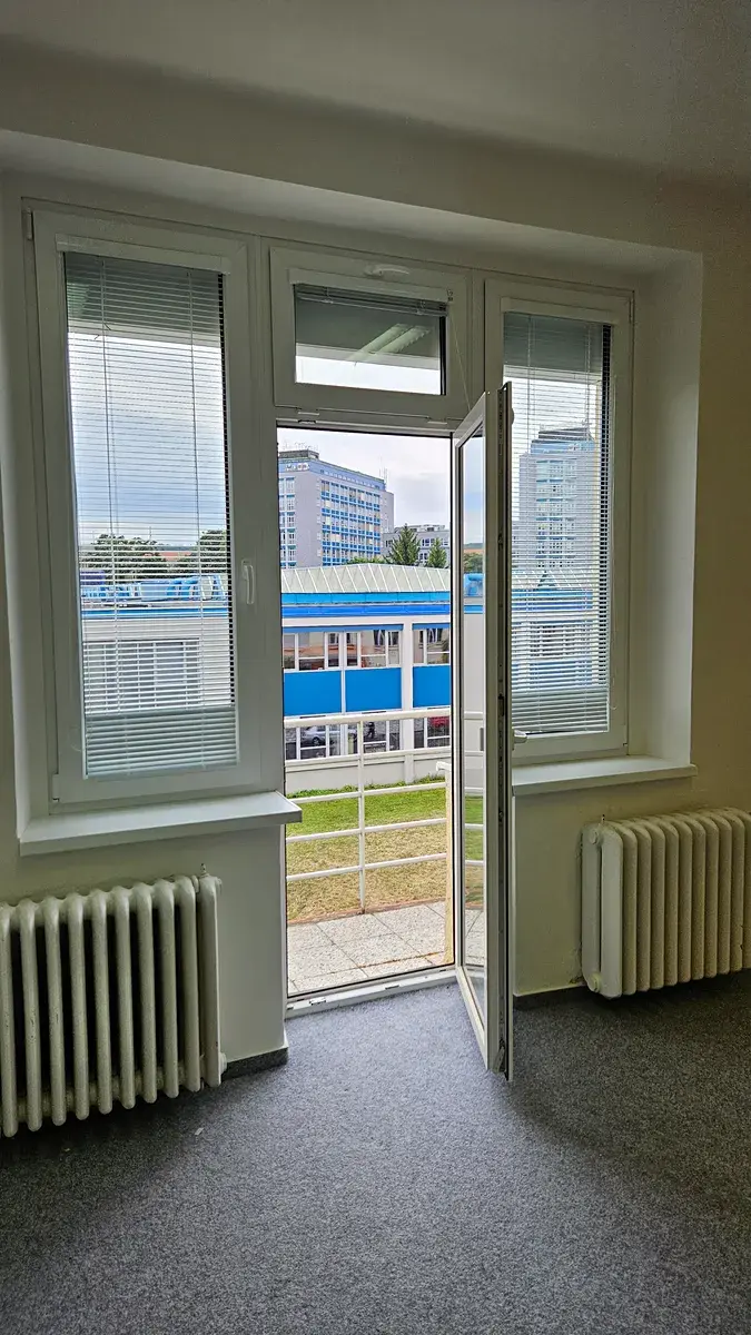 Nová okna s trojsklem a venkovními žaluziemi, zátěžový koberec, příprava pro připojení internetu.