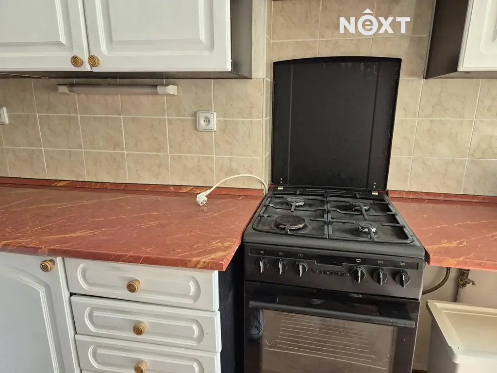 Na fotografiích můžete vidět prostornou kuchyň s linkou, která obsahuje plynový vařič, troubu a digestoř.