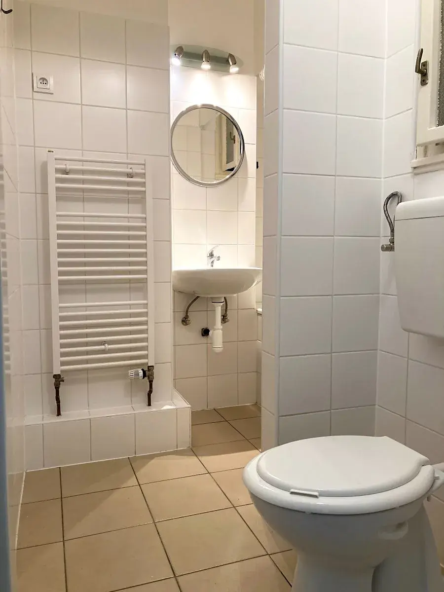 společné s WC je na podlaze keramická dlažba, v chodbě a obou pokojích