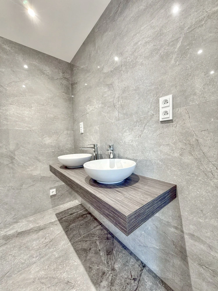 Vysoký standard projektu podtrhuje luxusní provedení a moderní technologie, jako jsou úsporná tepelná čerpadla vzduch–voda, podlahové vytápění, kvalitní okna s trojskly, příprava pro předokenní rolety, rekuperace vzduchu a chytrá domácnost Loxone.