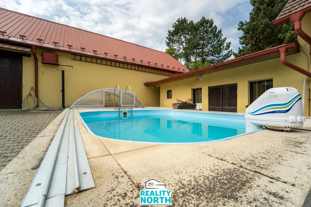 Na pozemku je dále dílna, prostorná dvoupodlažní stodola, prostorná garáž pro 2 osobní automobily, zastřešený bazén 3*4m s protiproudem (hloubka bazénu 1,6m).