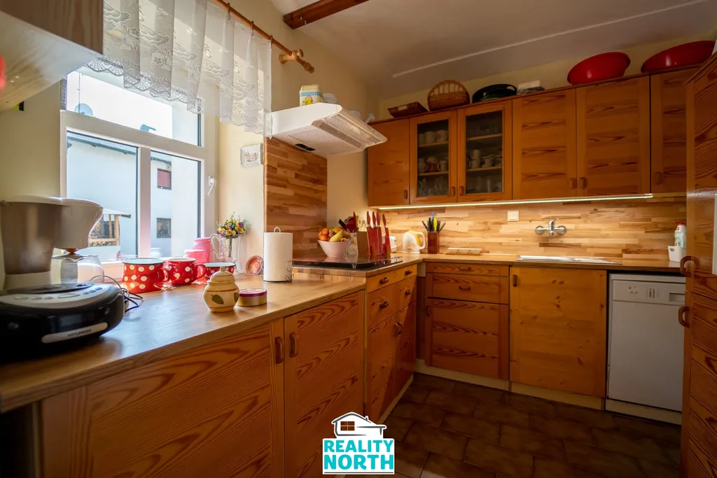 V prvním rodinném domě je v 1.NP obývací prostor s krbem na dřevo, kuchyně s plynovým sporákem a elektrickou troubou, nově zrekonstruovaná koupelna s hydromasážním sprchovým koutem,