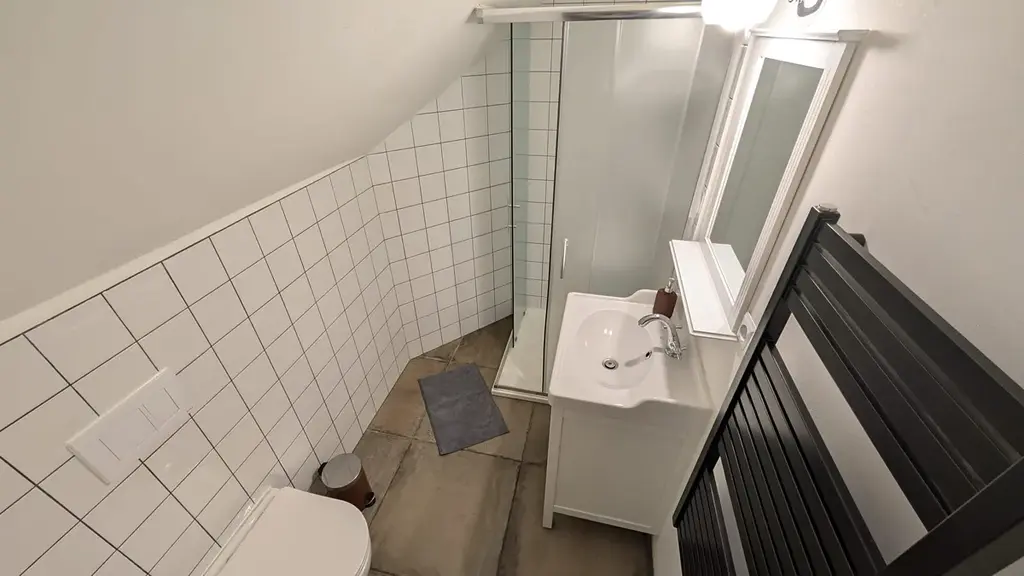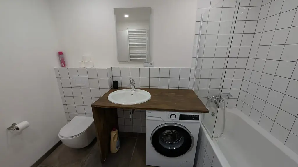 Byt prošel kompletní rekonstrukcí v roce 2023 a nabízí moderní, funkční a příjemné bydlení. Vytápění i ohřev teplé vody jsou řešeny elektrickým kotlem. Dispozičně je řešen jako dvoupodlažní – spodní část tvoří prostorný otevřený obytný prostor s kuchyní a jídelnou, koupelna s vanou a samostatná ložnice. V horním patře se nacházejí dvě ložnice a koupelna se sprchovým koutem.