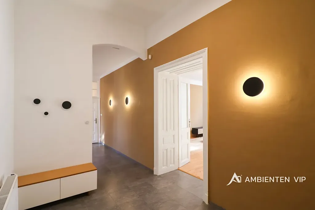 Byt o celkové podlahové ploše 143,49 m² se nachází v 2. nadzemním podlaží a nabízí velmi prostorné místnosti s vysokými stropy, které dodávají interiéru vzdušnost a reprezentativní charakter. Celý prostor zároveň nese jedinečný genius loci tohoto domu. Prostory bytu jsou kompletně zařízené a připravené k okamžitému nastěhování.