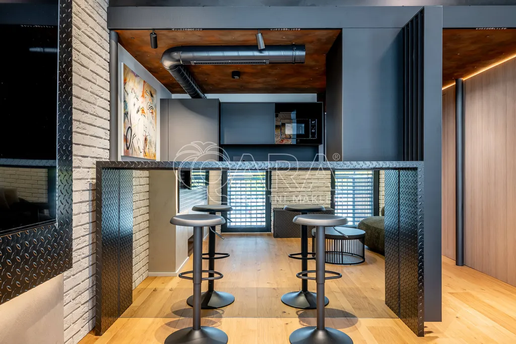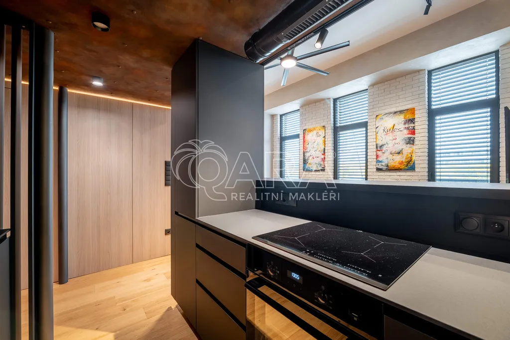 Součástí vybavení je na míru zhotovená kuchyňská linka s vestavěnými spotřebiči (indukční varná deska, digestoř, elektrická trouba, mikrovlnná trouba, myčka, lednice s mrazákem). Byt je kompletně zařízený včetně sedací soupravy, TV, konferenčního stolku, barových židlí, postele v horním patře a dostatku úložných prostor. V koupelně je sprchový kout a WC, k dispozici také pračka. Podlahy jsou dřevěné, v koupelně je dlažba. Veškeré zařízení bylo realizováno na zakázku renomovaným architektem.