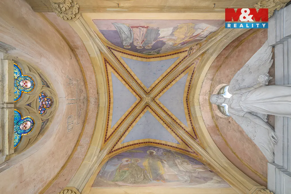 Dominantou interiéru je dobová nástěnná malba s výrazným výtvarným charakterem, doplněná vitrážemi s biblickými motivy. Celek působí harmonicky a zachovává autentický historický výraz.
