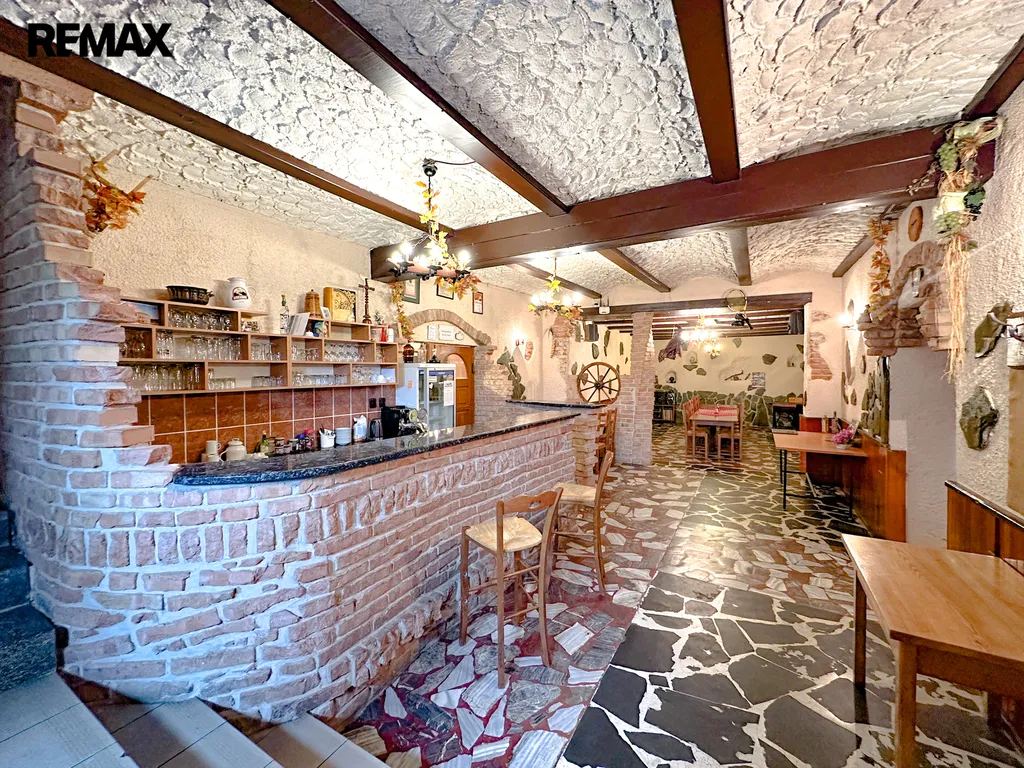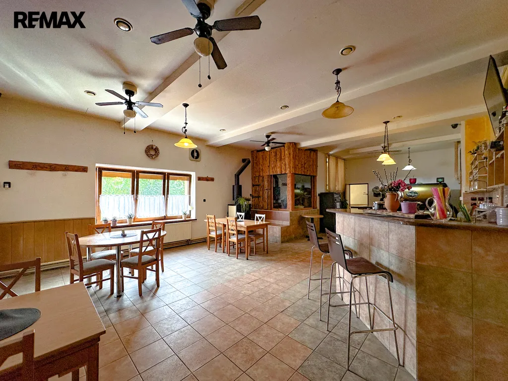 Součástí objektu je restaurace s kapacitou přibližně 70 míst, která disponuje plně vybavenou kuchyní, skladovými prostory a odděleným sociálním zázemím pro hosty. K dispozici je také samostatný salónek vhodný pro soukromé akce či firemní setkání. Restaurace je doplněna o venkovní terasu se zděným grilem, ideální pro letní provoz. Vytápění je zajištěno plynovým kotlem a kotlem na tuhá paliva.