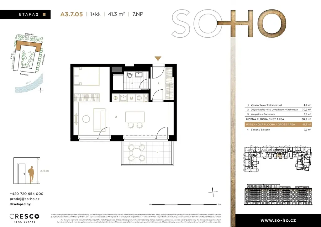 Efektivně řešený byt s klimatizací o dispozici 1+kk (41,3 m² ) s prostorným balkonem (7,2 m² ) se nachází v 7. nadzemním podlaží moderní novostavby 2. etapy SO-HO Rezidence, v atraktivní lokalitě jižních Holešovic. Dominantou bytu je otevřený obývací pokoj propojený s kuchyňským a jídelním koutem, který působí vzdušně a harmonicky. Na obytnou část přirozeně navazuje balkon orientovaný do klidného vnitrobloku, ideální pro ranní kávu či relax po práci. Součástí dispozice je také promyšleně oddělená spací zóna s úložným prostorem, která zajišťuje dostatek soukromí a klid pro každodenní odpočinek.
