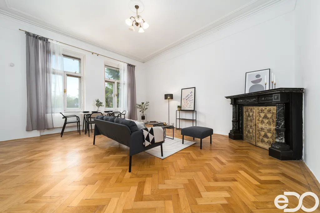 127 m² plus sklep, stropy téměř čtyři metry, světlo opírající se o původní parkety a krb, který tvoří přirozené centrum celého bytu.