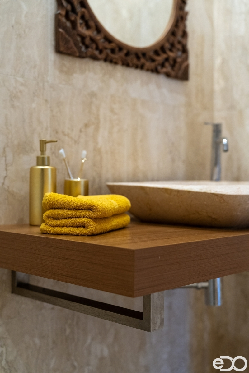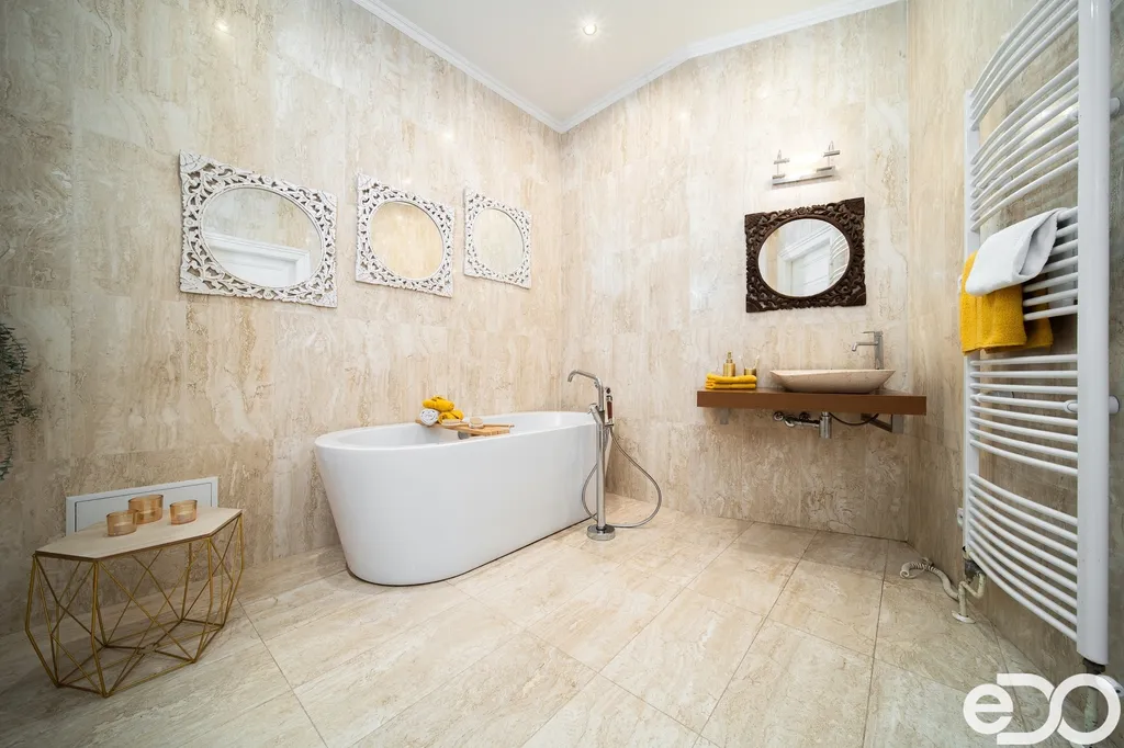 Koupelna je provedena z kvalitních materiálů, s podlahovým vytápěním pro maximální tepelný komfort. Podlahové topení je instalováno také v pokoji do vnitrobloku pod novou dlažbou.