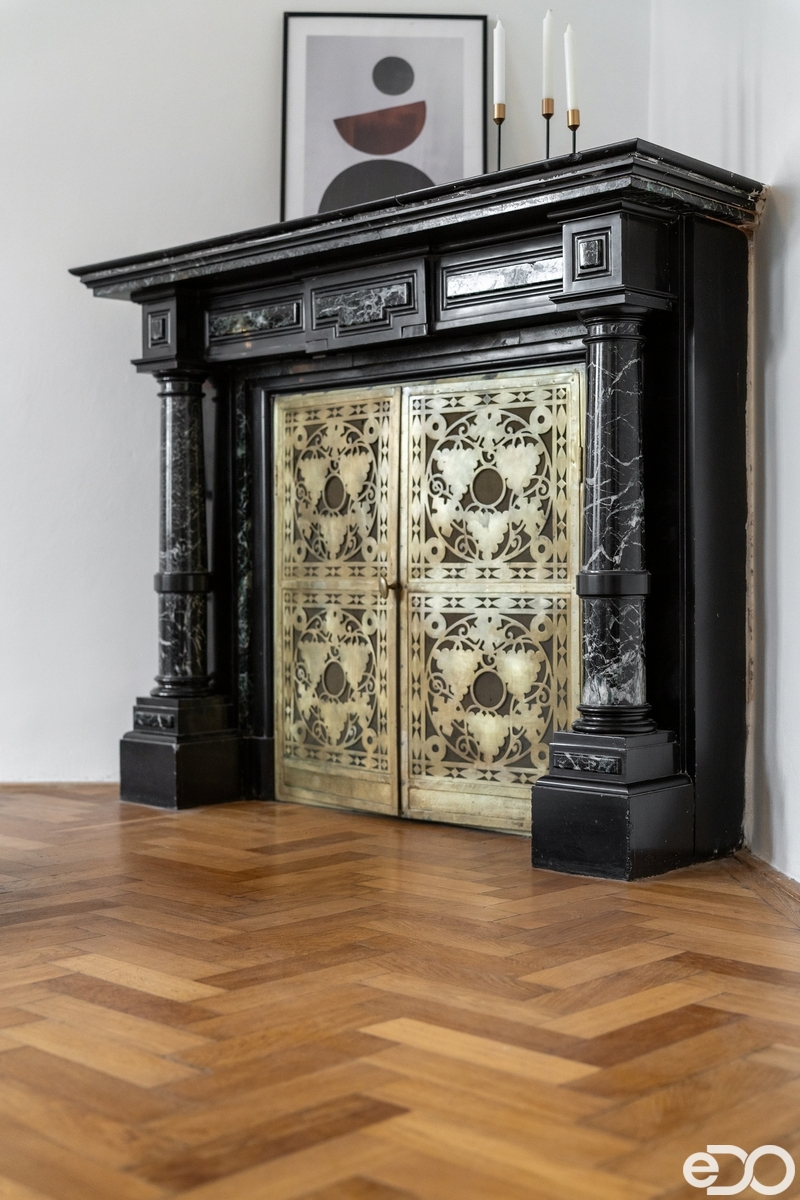 Zachovány a repasovány byly původní parkety, interiérové dveře s kazetovými obložkami secesní krb. Ten sice není funkční, je ale dominantním prvkem obývacího pokoje a dotváří jedinečnou atmosféru a pocit pravého domova.