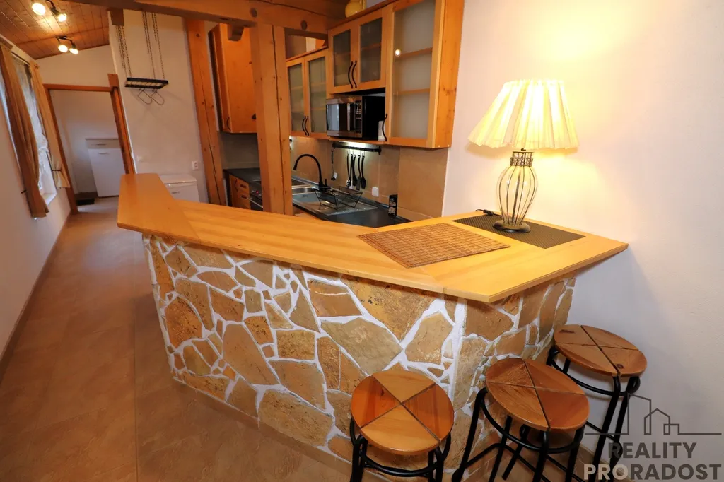 - Komfort: Obývací část je rozdělena na odpočinkovou zónu se sedací soupravou a spací kout. Atmosféru zpříjemní krbová kamna, samozřejmostí je ústřední topení, připojení k internetu a TV.