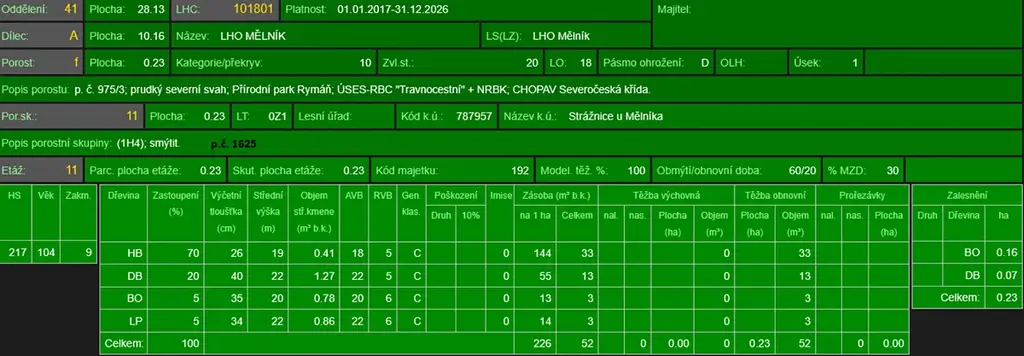 - p.č. 1625 vedená jako lesní pozemek o celkové výměře 2 458 m2 (stáří lesa 113 let - zastoupení dřevin habr, dub, borovice, lípa),