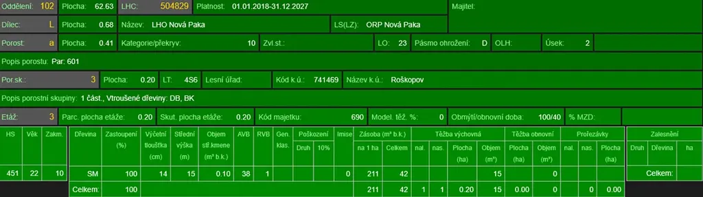 - p.č. 601 vedená jako lesní pozemek o celkové výměře 4 122 m2, z toho vlastníme podíl 1/4 tedy 1 031 m2 (stáří lesa 98 let a 30 let - zastoupení dřevin smrk).