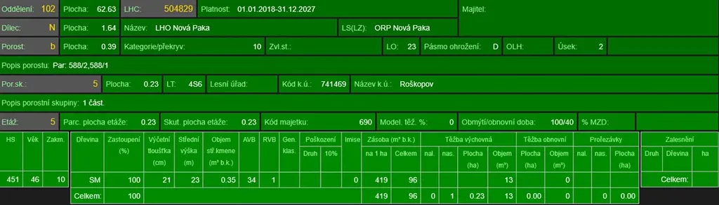 - p.č. 593/1 vedená jako lesní pozemek o celkové výměře 10 306 m2, z toho vlastníme podíl 1/4 tedy 2 577 m2 (stáří lesa 55 let a 41 let - zastoupení dřevin smrk),