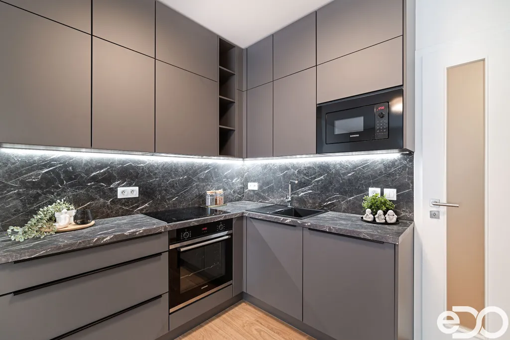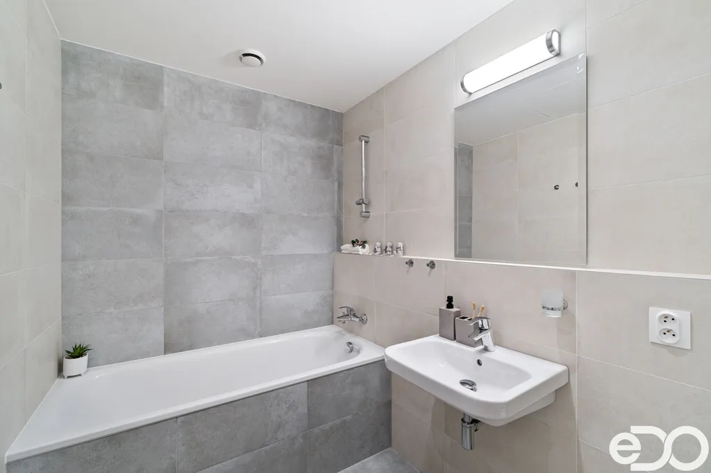 Největší místnost v bytě slouží jako kuchyně s jídelním koutem a obývací pokoj zároveň. Moderní kuchyňská linka je vybavena vestavnými spotřebiči. Další místnost pak slouží jako ložnice a má menší šatnu. Z obou pokojů je pohodlný vstup na terasu. Koupelna je vybavena vanou a nabízí dost místa pro umístění pračky se sušičkou. Výhodou je také samostatně umístěná toaleta.